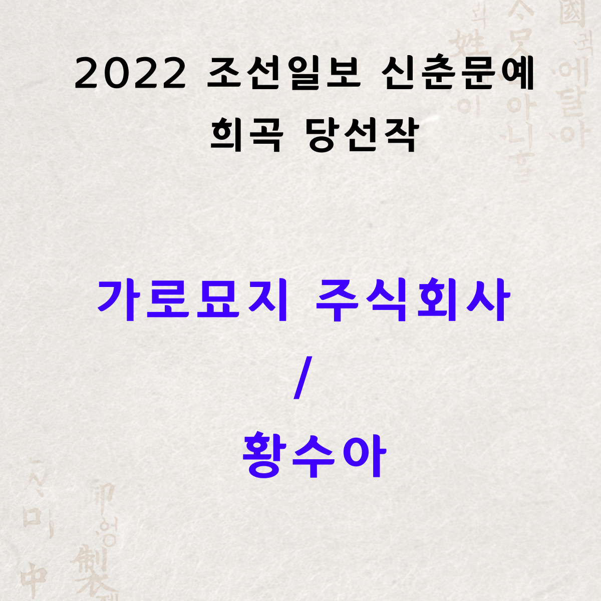 ‘가로묘지 주식회사’는 최근 몇 년 동안 저와 저의 친구들이 겪은 어려움을 담은 작품입니다. 셰익스피어의 말처럼 세상은 하나의 무대인 것 같습니다. 극적인 사건은 현실 속에 늘 존재합니다. 앞으로도 저는 ‘좋은 희곡은 무엇일까’에 대해 여러 질문을 던지겠지만 삶의 기저에서 그것을 발견하기 위해 노력할 것이라는 점만은 분명합니다. 부족한 작품을 뽑아주신 심사위원들께 큰 감사인사 올리며, 늘 저를 믿고 응원해주는 가족들에게 사랑하는 마음을 전합니다. 극작가는 20년 넘게 저의 꿈이었습니다. 이 시작을 씨앗으로 희곡 창작에 꽃 피우자는 결심을, 지면을 빌려 스스로에게 약속해봅니다.