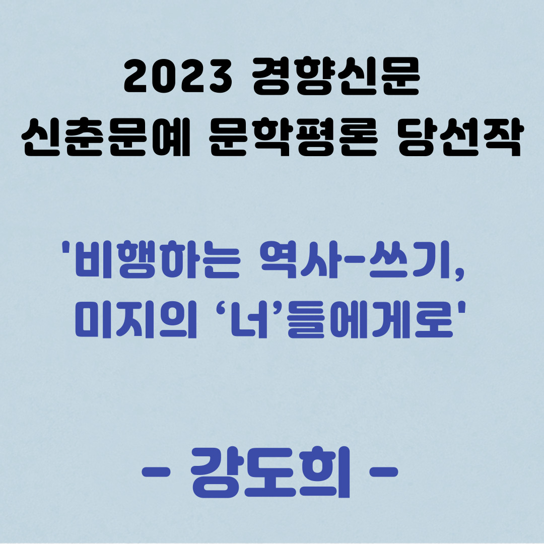 강도희의 <비행하는 역사-쓰기, 미지의 ‘너’들에게로>는 한국문학에서 지속적으로 전개되었던 ‘역사-쓰기’의 문제를 한강의 <작별하지 않는다>와 정세랑의 <시선으로부터,>에 나타난 “모성적 역사가들의 형상”에 주목하여 추적해 들어간 글이다. 이 글을 당선작으로 결정하는 데에 그리 오래 걸리지는 않았다. 글을 관통하는 문제의식과 그것을 뒷받침하는 현상, 텍스트와의 섬세한 대화, 비평적 논리를 구조화하고 이야기의 세부를 장악하는 능력에서 두루 안정적인 기량을 보여주었기 때문이다. 하지만 이는 단지 비평적 글쓰기의 숙련도만을 의미하지는 않아서, 마지막 페이지에 다다랐을 때 글의 메시지는 의연하게 빛났다. 이번 당선작이 과거와 현재의 조우에 미래라는 선분을 더한 것처럼, 지금 한 신인의 출현이 ‘미지의 삶들과 우연히 마주할 미래’를 열어가는 절실한 ‘조각’ 하나가 되기를 바란다. 당선을 축하한다.