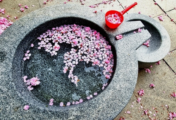 사진은 먼저 ‘멈춤’을 만들어낸다. 커다란 돌확에 물이 고여 있고, 그 위에 연분홍 꽃잎들이 무리지어 떠 있다. 바닥에도 꽃잎이 흩어져 있어 방금 지나간 계절의 흔적이 고요하게 남아 있음을 보여 준다. 특히 시선을 강하게 끄는 것은 빨간 바가지이다. 빨간색은 즉각적인 행동을 유도하는 색이며, 바가지는 물을 ‘떠서’ 단숨에 마시게 하는 도구이기도 하다. 이때 물은 급하게 해결하고 싶은 갈증과 닮아 있고, 바가지는 빨리 처리하고 싶은 마음의 손짓과 닮아 있다. 그러나 물 위에 떠 있는 꽃잎은 그 속도를 자연스럽게 늦춘다. 꽃잎을 보는 순간 사람은 마시기 전에 한 번 더 바라보게 되고, 그 한 번의 시선이 곧 멈춤이 된다. 사진은 이 멈춤을 통해 작품의 메시지를 이미 절반쯤 말해 버린다.