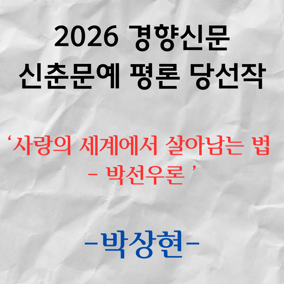 | [2026 동아일보 신춘문예 문학평론 당선작] 나-나 연대기: 멸망 이후에도 살아남는 세 가지 시적 방법 / 박지민 (0) | 2026.01.11 |